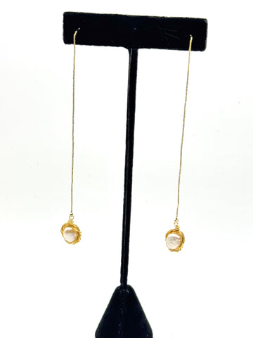 Gold chain + white pearl dangles earrings. 4 inches long.