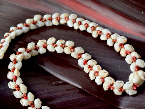 All Natural Color. Hard to find, Niihau Momi and red Kahelelani shells in the Heleconia pattern.