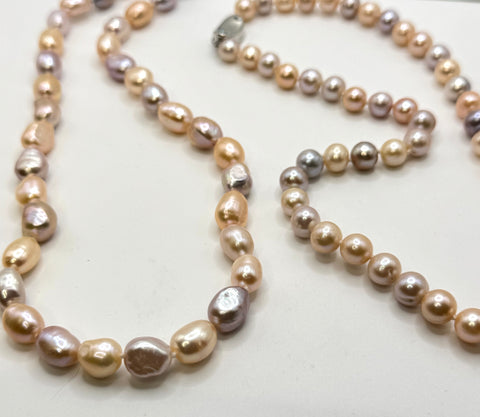 Only one set available! Two 18 inch pastel pearl necklaces and three pair of pearl earrings: white, pink and grey. All five pieces for $139.