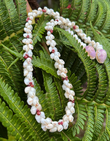 Gorgeous Niihau Roselani style necklace. Niihau Momi and Kahelelani shells fashioned into a classic style that mimics a real rose flower Lei. Matching Niihau Roselani earrings included. Traditional Poleholeho shell closure.