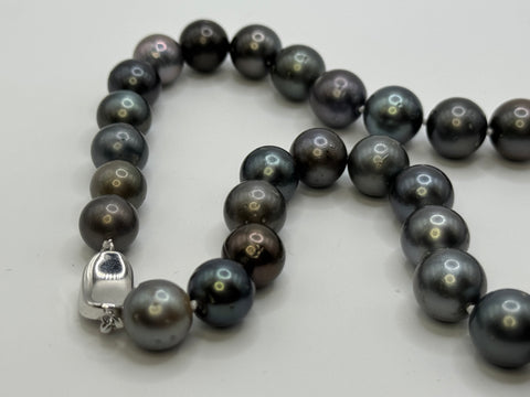 Only one available. 18 inch genuine Tahitian Pearl necklace. Hand knotted (10-12mm) Tahitian pearls. Greta color and luster. Sterling silver pinch, security clasp.