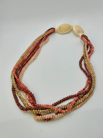 20 inch, five strand, five color all Niihau Kahelelani shells. This is a gorgeous collection all in one Lei. Pink, green, red, brown and light pink strands with traditional double Poleholeho shell closure.